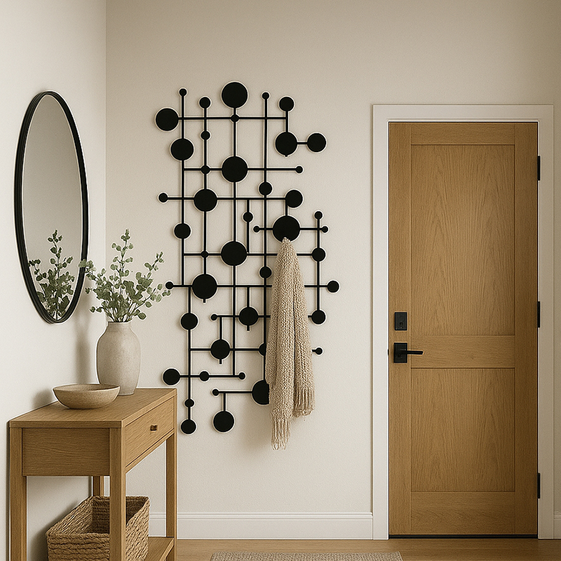 Wieszak Konstelacja doskonale sprawdzi się w przedpokoju, sypialni, salonie, biurze lub pracowni artystycznej. Co więcej, świetnie pasuje do wnętrz w stylu loftowym, industrialnym, nowoczesnym i minimalistycznym, podkreślając ich wyjątkowy charakter.