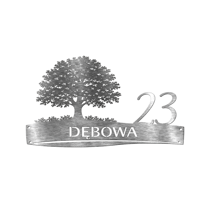 Oznaczenie adresowe wykonano z wytrzymałej stali, dlatego jest odporne na działanie czynników zewnętrznych. Dodatkowo zastosowano technologię wycinania laserowego, która zapewnia wysoką precyzję detali. W rezultacie nazwa ulicy Dębowa oraz grafika są czytelne nawet z większej odległości.