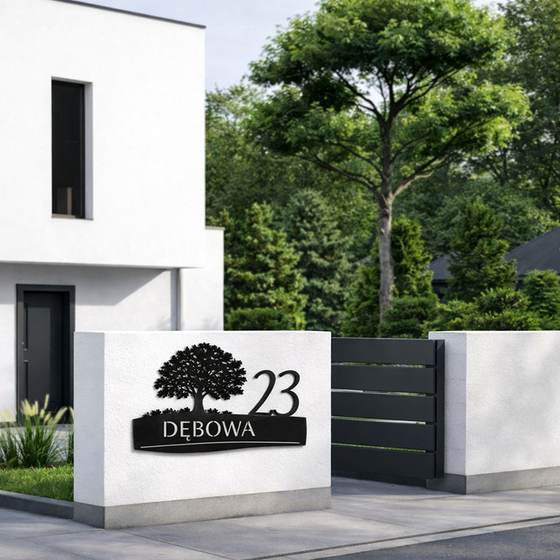 Metalowa tablica adresowa Dębowa z grafiką – nowoczesne oznaczenie adresu domu