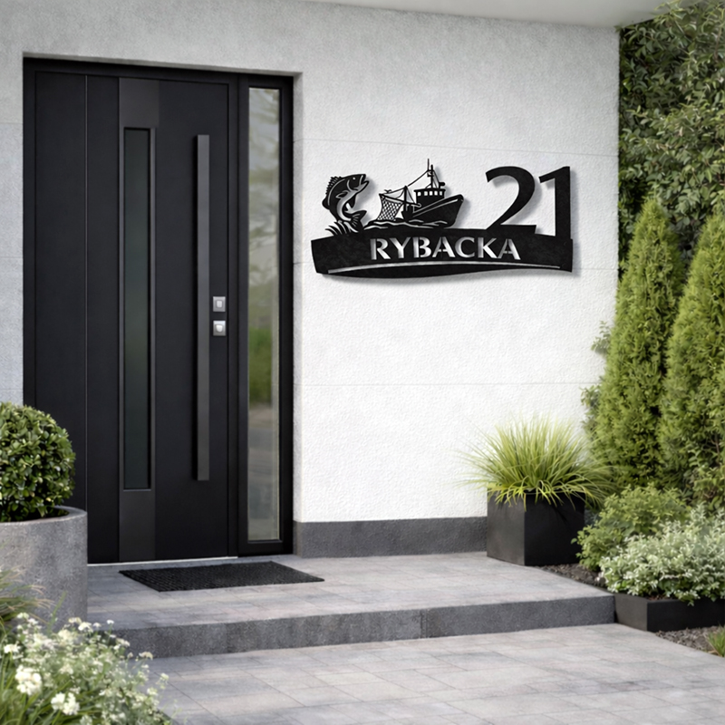 Tablica adresowa Rybacka z grafiką wyróżnia się nowoczesnym designem. Dzięki temu doskonale pasuje do współczesnych domów. Jednocześnie dobrze komponuje się z klasyczną architekturą. Dlatego jest rozwiązaniem uniwersalnym.