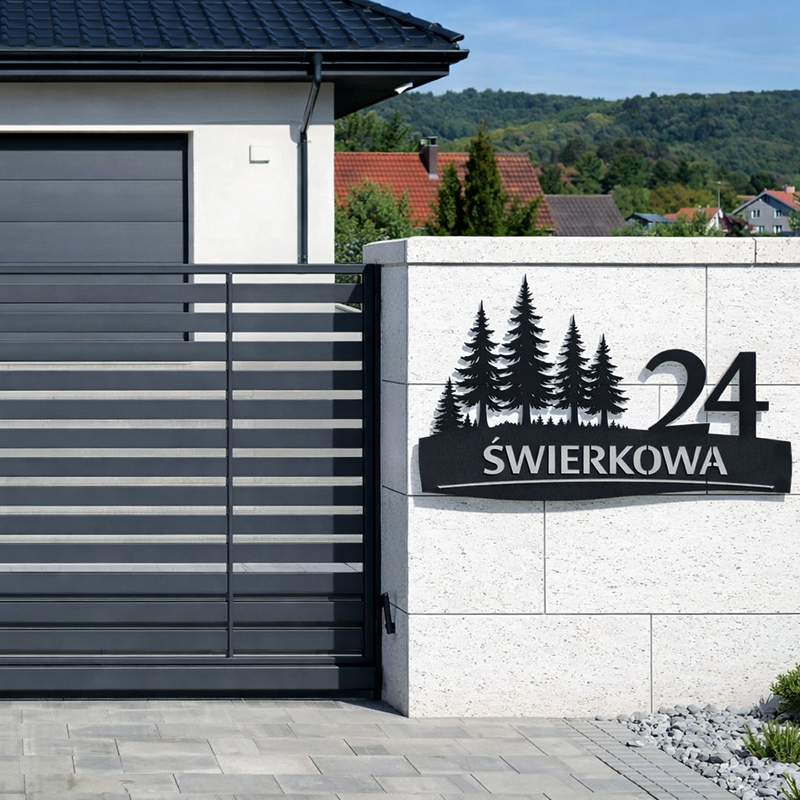 Metalowa tablica adresowa Świerkowa z grafiką – trwałe i czytelne oznaczenie domu